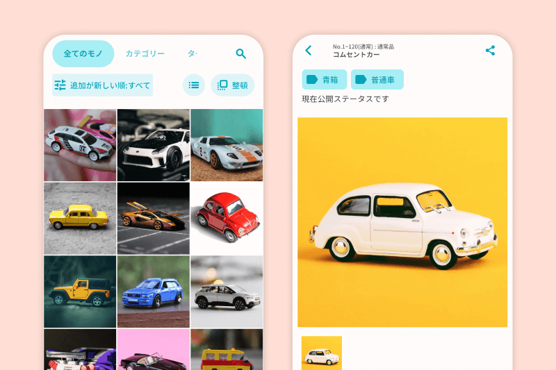 汎用型のコレクション管理アプリ「モノコレ」なら、トミカ1台1台に対して自分のオリジナル管理項目を追加したり、写真登録ができる方が、満足度の高いコレクション管理ができる可能性が高いです。