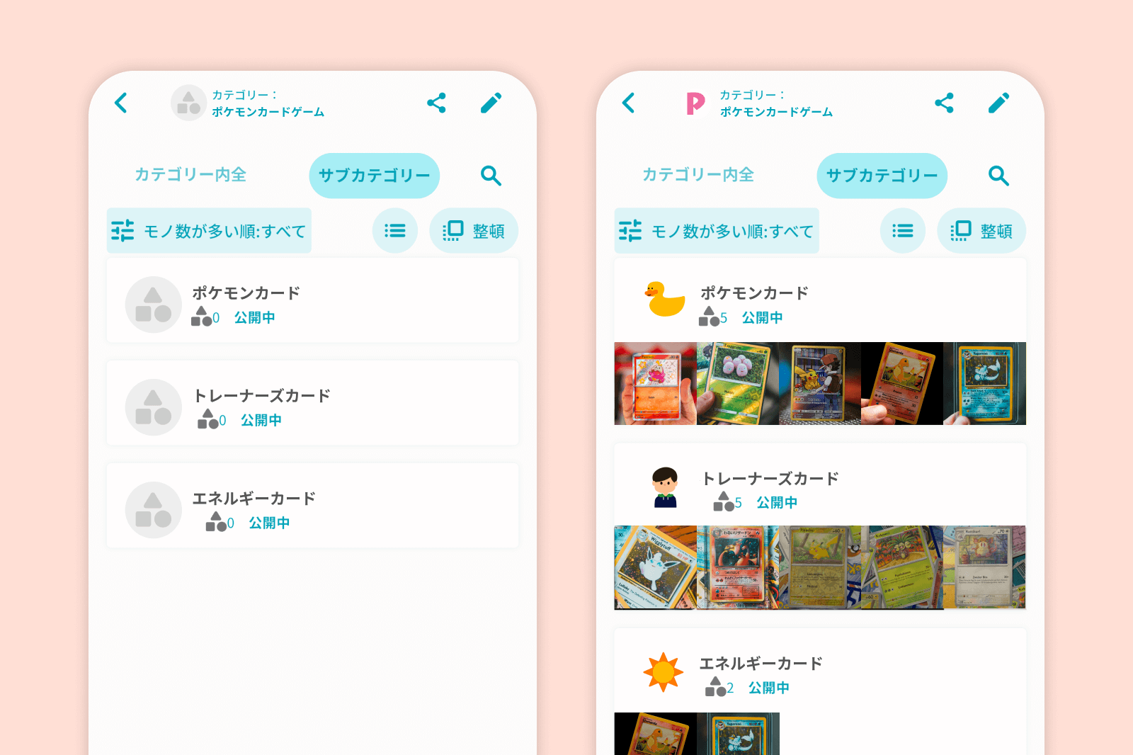 たとえばポケモンカードゲームのカテゴリーの中には、「炎タイプ」「水タイプ」、ポケモン以外のカードなら「トレーナーズ」や「エネルギーカード」などのサブカテゴリーを作れば、より深い管理が可能になります。