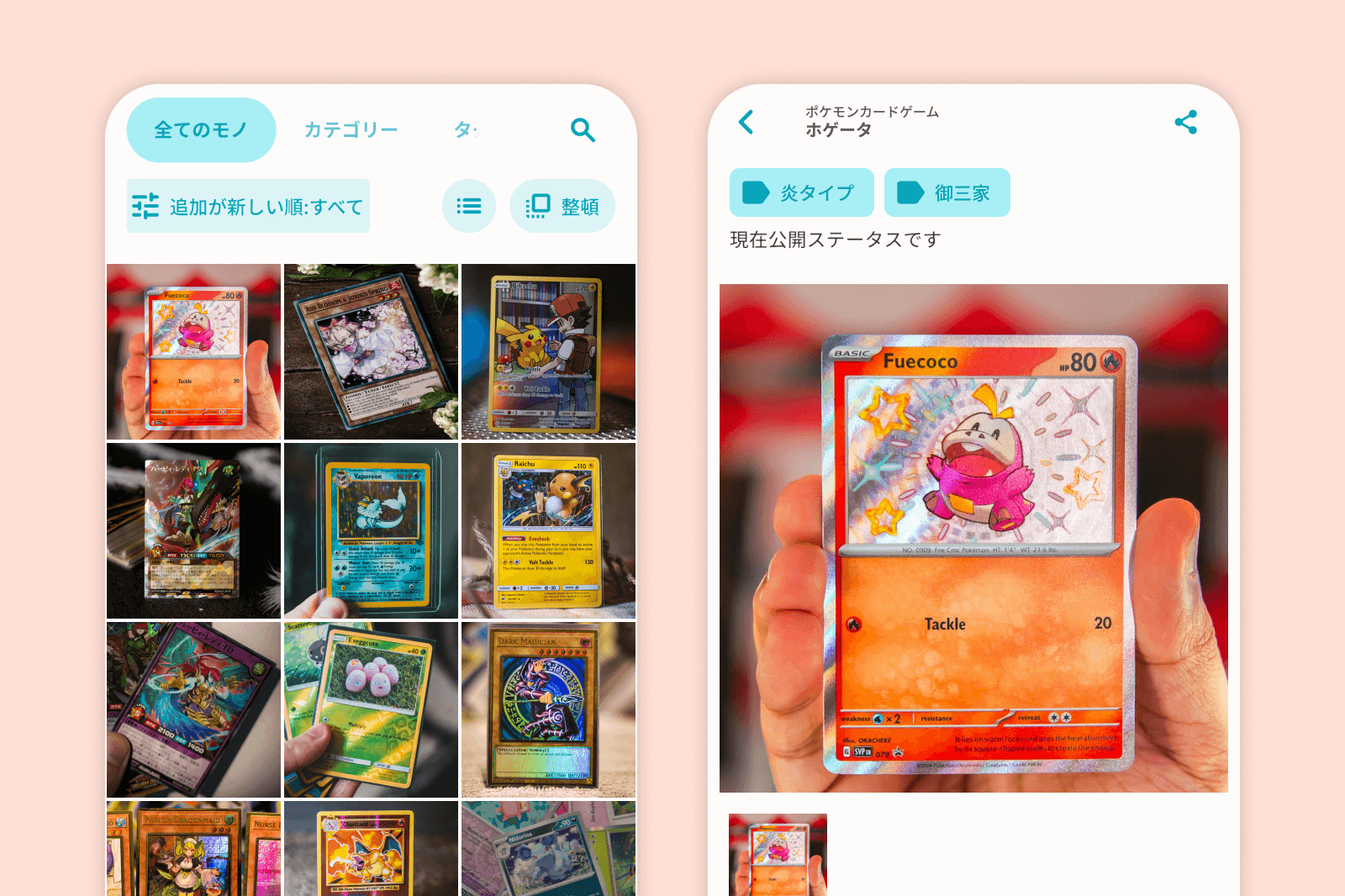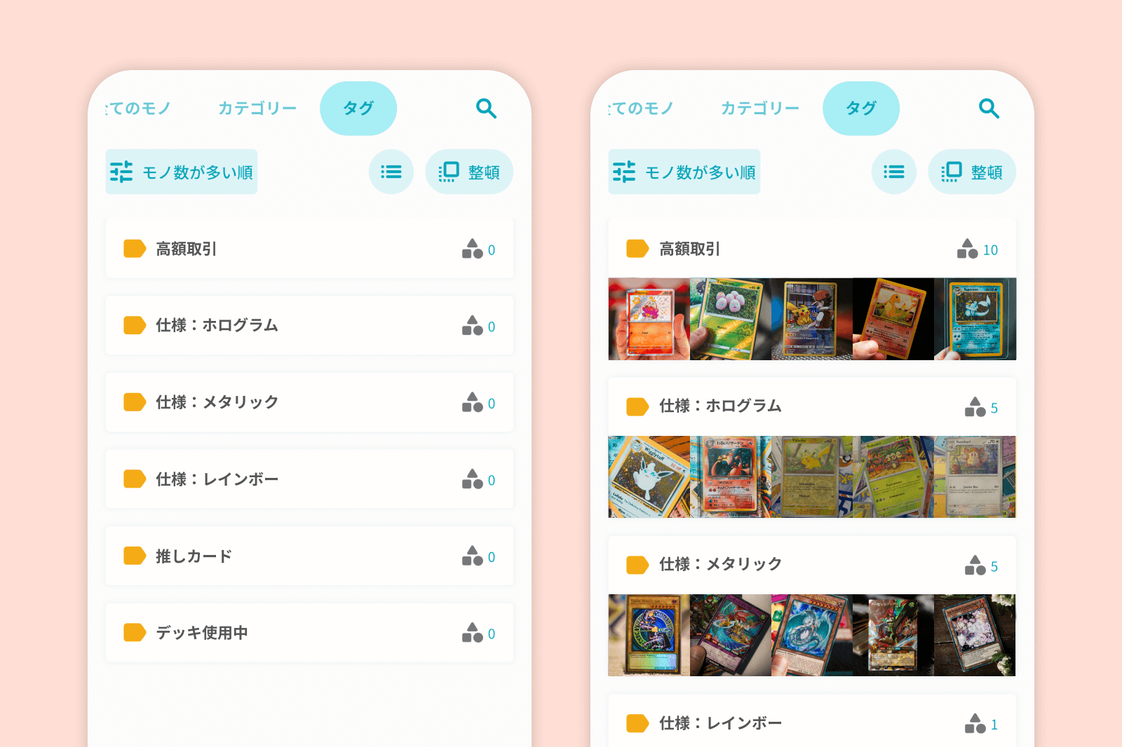 同じキャラクターで違うカードが出ているようであれば、キャラクター名をタグにしてカードに付与したり、高額取引できるカードに「高額取引」のタグをつけたりすることでカテゴリーをまたいで横断的な管理が可能です。