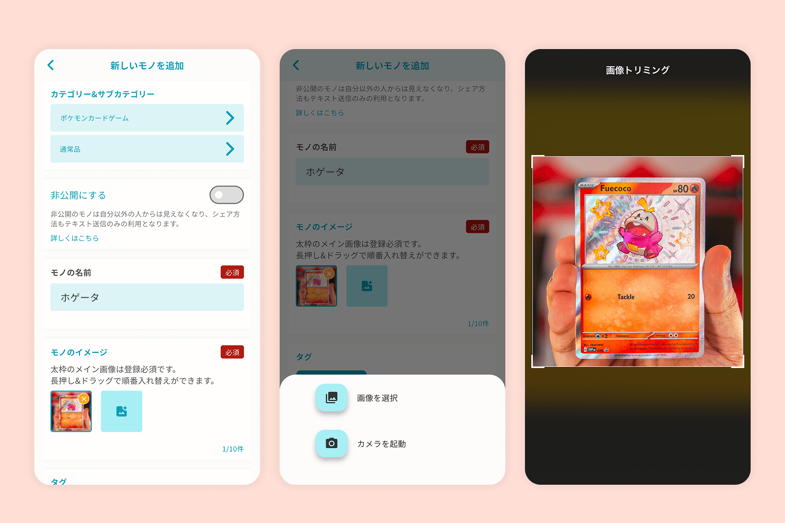 これまでの準備が整ったら、カードをモノコレに登録します。名前と画像を入力し、カテゴリーの分類とタグの付与を適切に行い、登録を完了します。画像は入力途中で撮影しながら登録することが可能です。